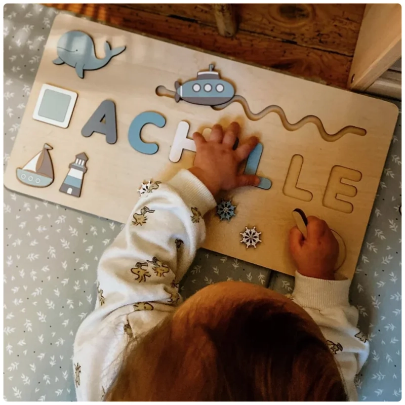CRÉÉ JUSTE POUR VOTRE ENFANT Chaque lettre est soigneusement découpée dans du bois doux, pour former SON prénom, rien qu’à lui.IL APPREND SANS S’EN RENDRE COMPTEEn manipulant les lettres, il développe sa mémoire, sa motricité… et sa fierté.UN SOUVENIR QU’ON GARDE TOUTE UNE VIECe puzzle ne finit pas au fond d’un coffre. Il reste en déco, puis dans une boîte à souvenirs.